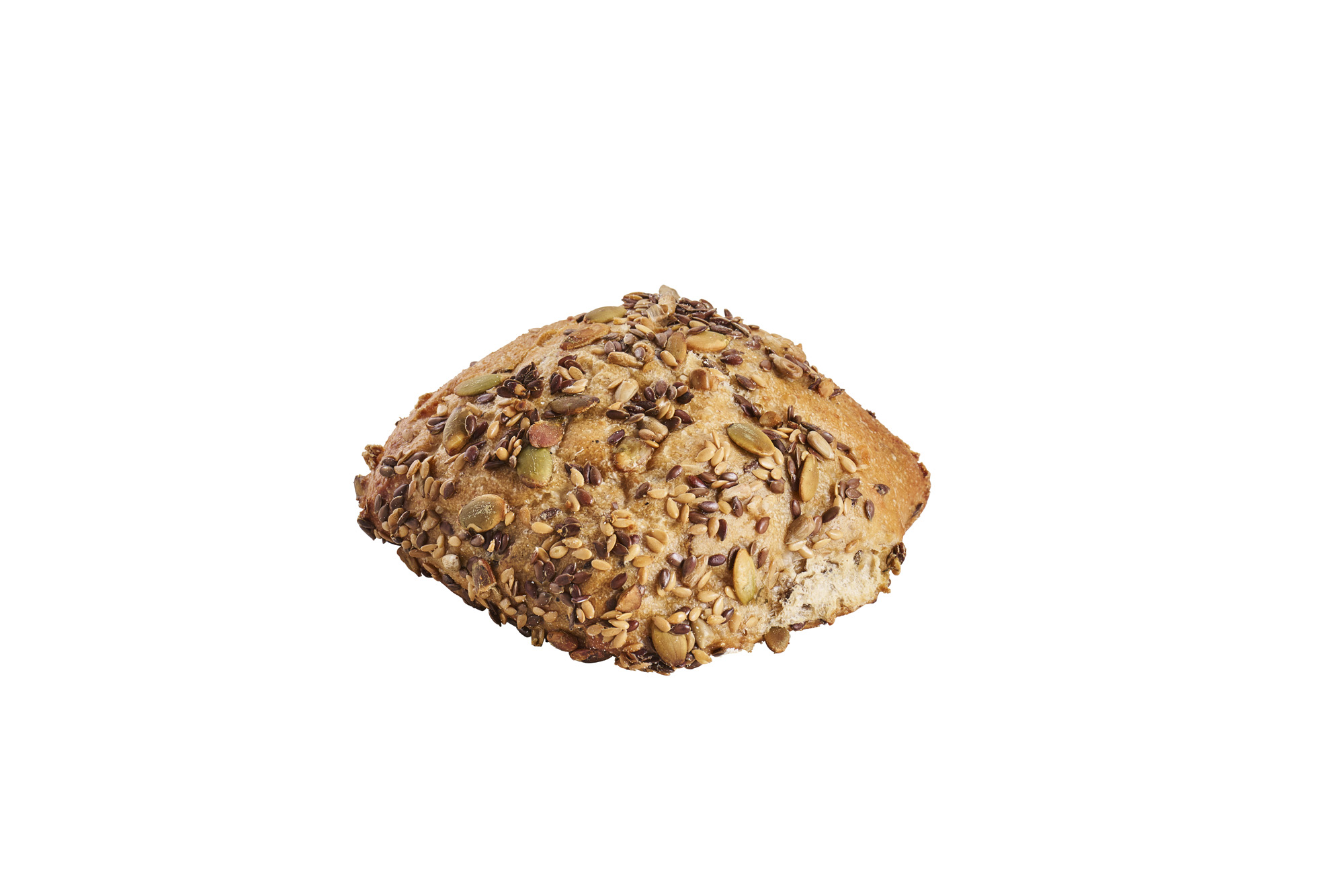Rustik surdejsbolle med masser af græskarkerner, solsikkefrø og hørfrø - både indeni og ristede som topping. Bagt med hvedesurdej. Kold- og langtidshævet (18 timer).